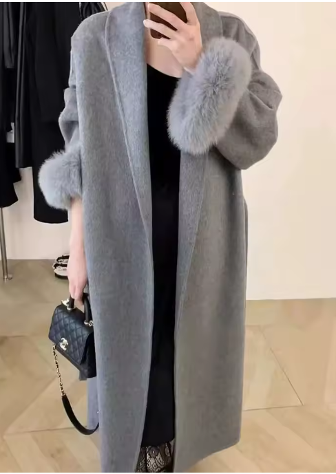 Dieser Mantel überzeugt mit seinem weichen Material, dem Figur schmeichelnden Bindegürtel und den edlen Fellbesätzen an den Ärmeln. Ein vielseitiger Mantel, der in mehreren Farben erhältlich ist und jedem Outfit einen Hauch von Luxus verleiht.